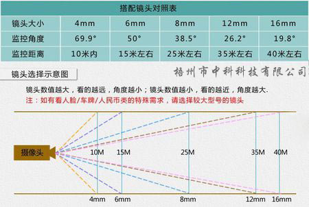 2、監(jiān)控?cái)z像頭的鏡頭毫米數(shù)值越小,看的越近(有效范圍),但是攝像頭的有效角度就越大或?qū)挘嵌却缶嚯x攝像頭近的東西也能很好的覆蓋,并且也能看清楚,反之看遠(yuǎn)了就不清晰。  所以一般店內(nèi)或超市,常用的都是4mm 6mm居多,特殊情況可以使用毫米數(shù)大的,這些都是視情況而定。